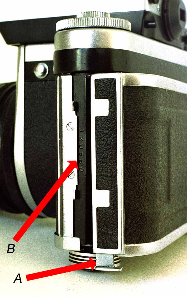 In passing, “B” on the same images above shows where the serial number is located on the body of the Pentacon Six and the Exakta 66. Note that with the