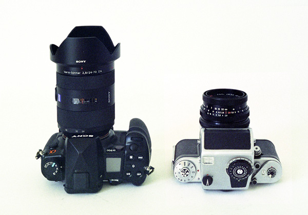 The Sony A900 with the most commonly-sold lens for it, the 24-70mm Carl Zeiss zoom. The Pentacon Six with its metering prism and standard 80mm Carl Zeiss lens. One of the surprises is that the sizes are so similar, even excluding the lenses. [c471_5a.jpg] |